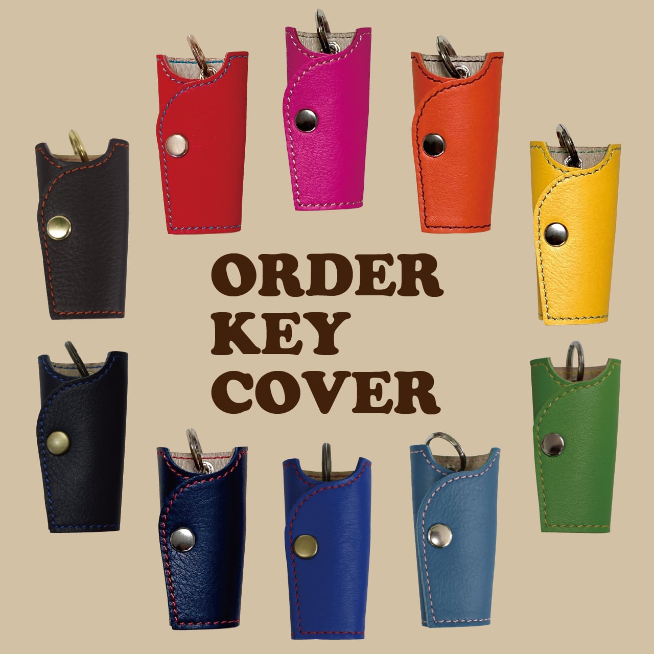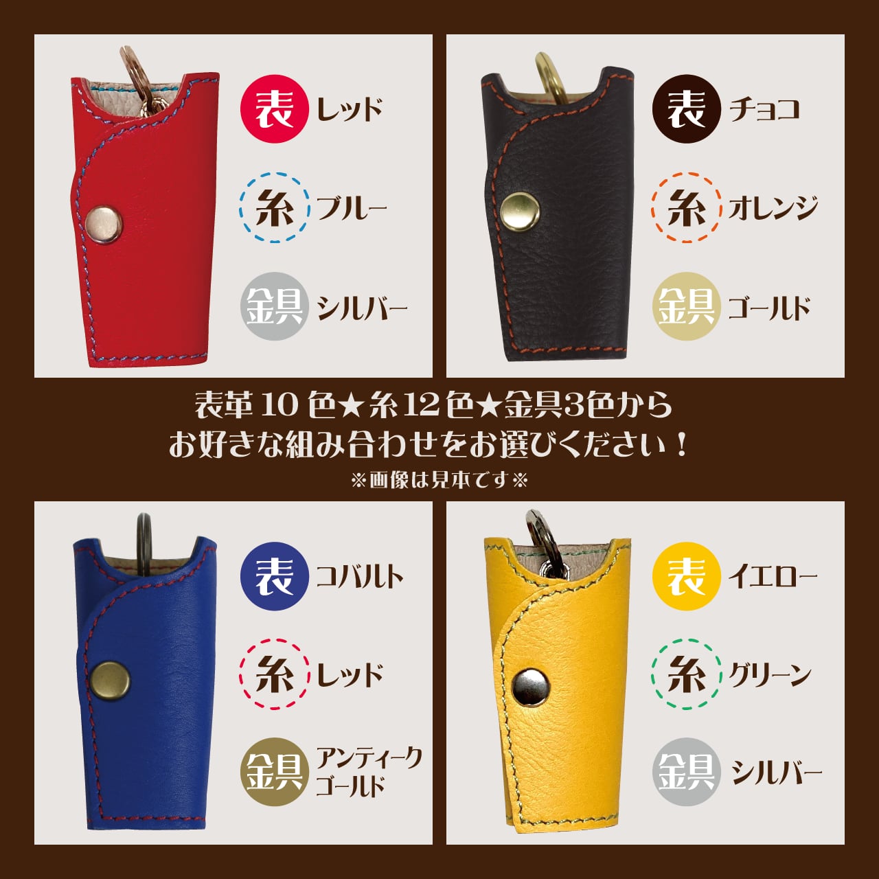10色の国産牛革・12色の糸・3色の金具からお好きな色を自由に組み合わせることで、世界に一つだけの特別なキーカバーが誕生します!