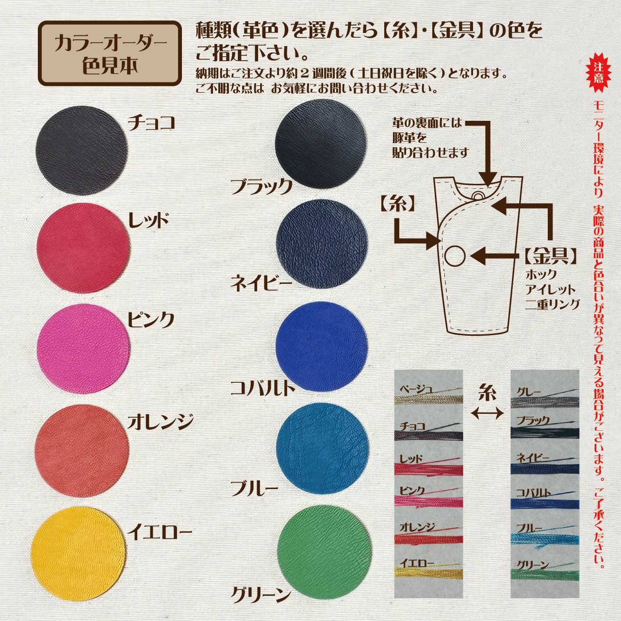 【カラー】お好きな色の牛革・12色の糸・3色の金具から自由にお選びください